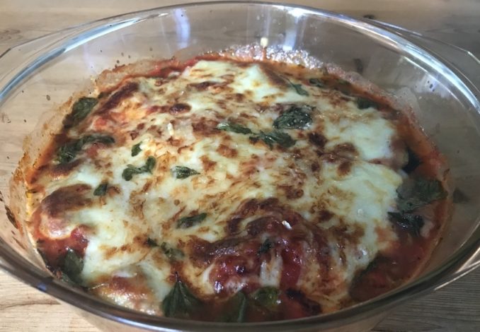 Zerkleinerten Knoblauch in Olivenöl kurz anbraten und mit den Tomaten 15 Min. köcheln lassen und würzen. Aubergine längs in 5mm dünne Scheiben schneiden und auf ein Backblech legen. Mit Olivenöl bestreichen und 15 Min. im Ofen bei 220 Grad Heissluft bräunen.