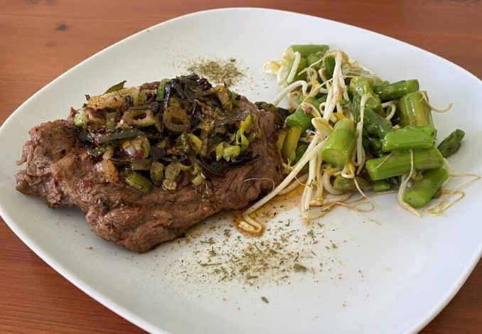 Lauch und Fenchel in dünne Streifen schneiden und mit Kokosfett und Butter in einer Pfanne anbraten. Danach Lauch und Fenchel an den Pfannenrand schieben und in der Pfannenmitte die beiden Steaks 5-7 Min. (je nach Gusto) auf beiden Seiten anbraten.
